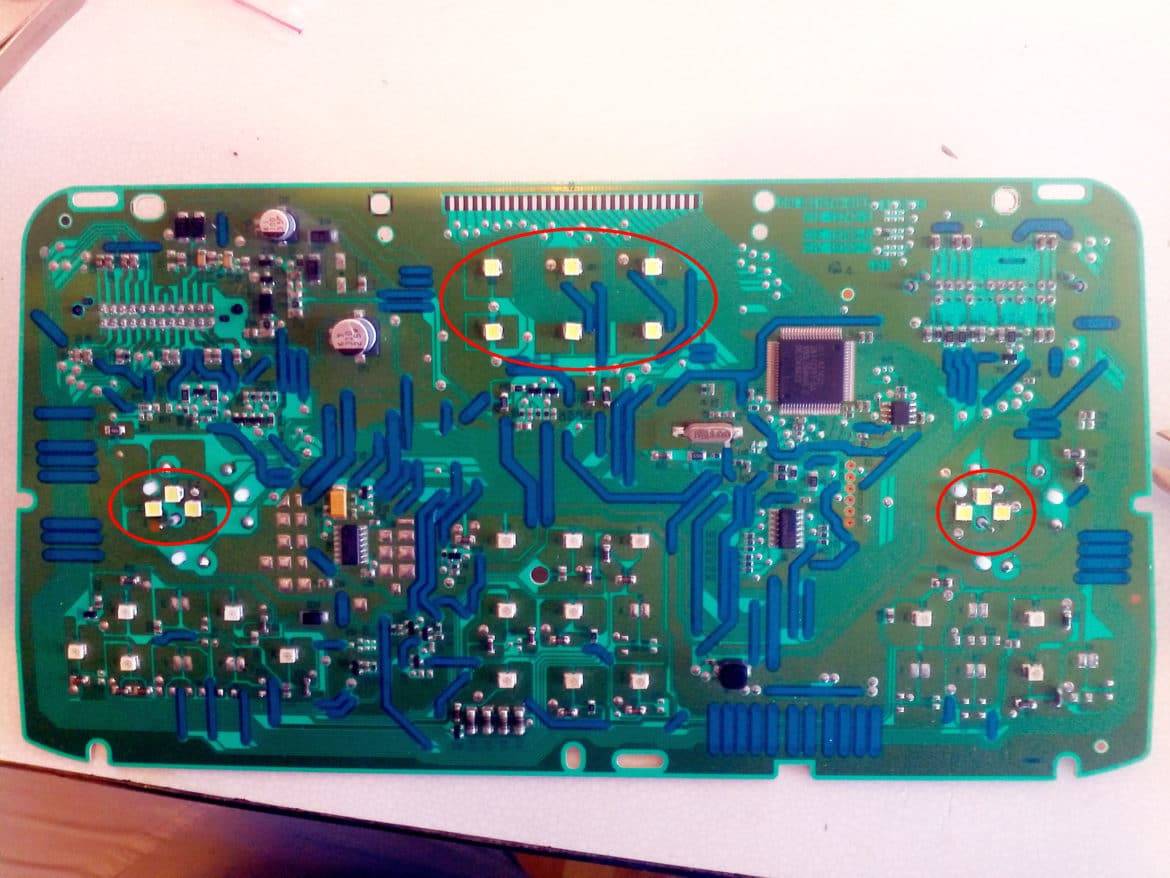 Как оказалось, никаких лампочек в панели приборов Рено Логан нет, их роли исполняют smd светодиоды 3528. Диоды подсветки стрелочных приборов и дисплея я обвел кружками, индикаторные, расположенные ниже, легко найти, ориентируясь на местоположение пиктограмм приборной панели.