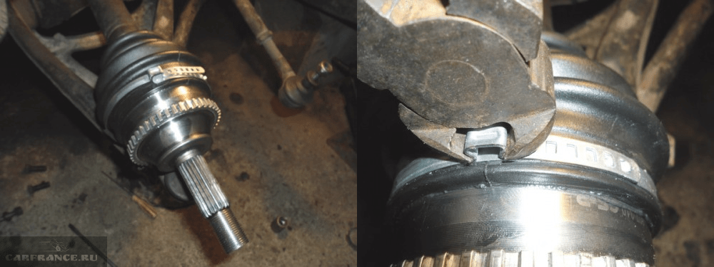 - Снять поврежденный наружный пыльник ШРУСа, ослабив хомуты его крепления (в зависимости от фазы, хомуты могут быть неразборными, придётся их пилить или ломать).
