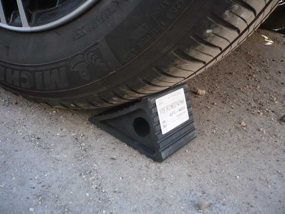 4. Затормозите автомобиль, подняв рычаг стояночной тормозной системы и установив под задние колеса противооткатные «башмаки».