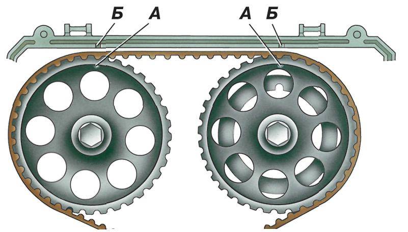 Конечно, подобную операцию проще выполнять вдвоём. Знайте, что нужному положению вала соответствует совмещение меток A-B и C-D (см. рис.).