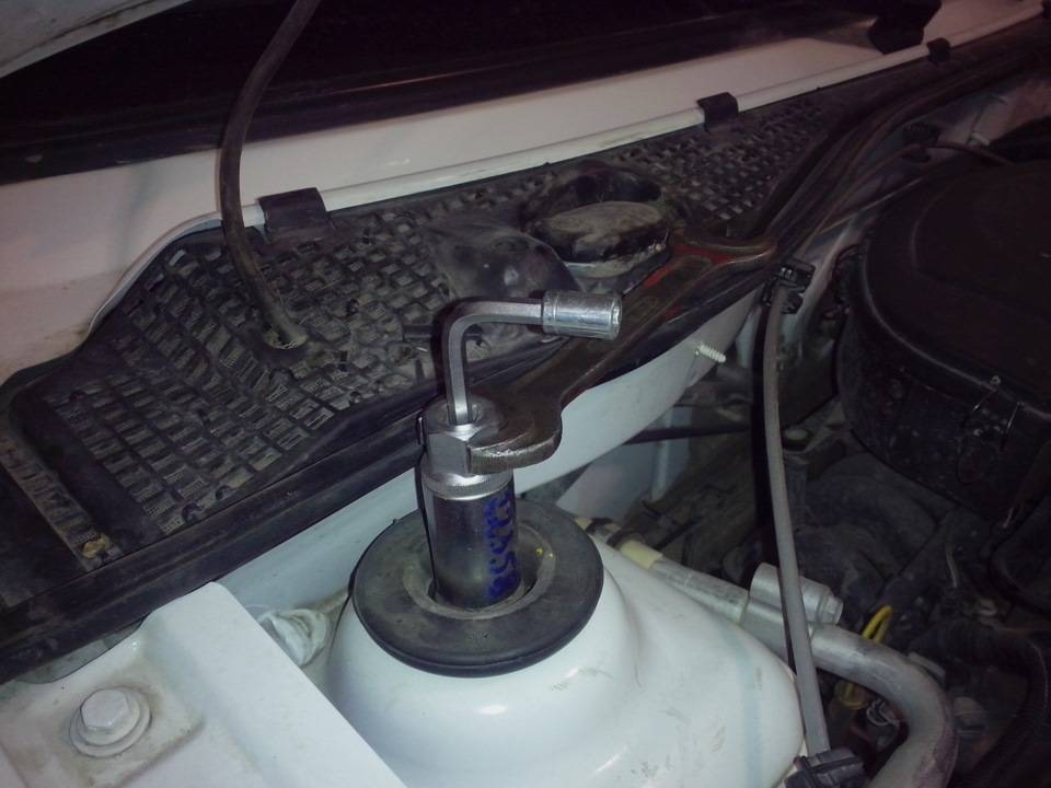8. Откройте капот и открутите гайку верхней стойки. Для откручивания берем гаечный ключ двадцать один и шестигранный ключ шестигранный, чтобы зафиксировать шток от проворачивания.