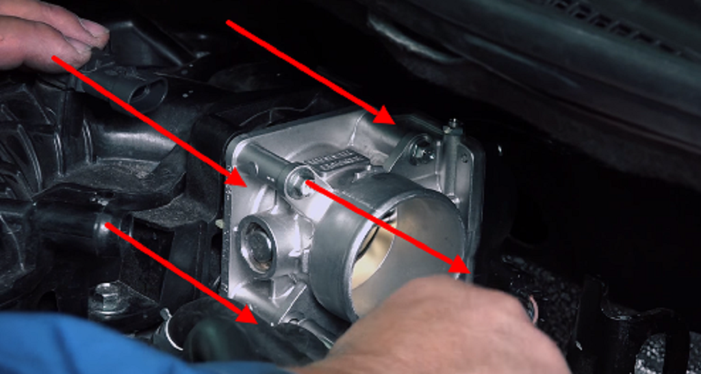 После этого нужно открутить дроссельный узел от впускного коллектора Renault Kaptur, который крепится 4-мя винтами. Они снимаются при помощи головки на 8. При этом вынимать узел из подкапотного пространства нужды нет, достаточно его просто открутить.