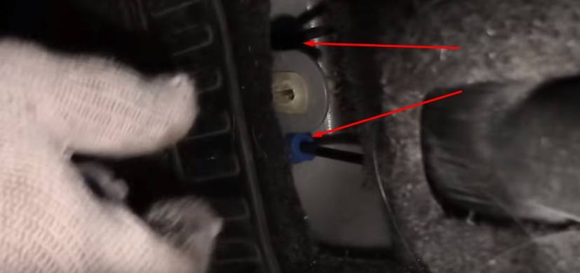 - После проделанных выше действий сдавите плоскогубцами фиксирующий элемент защитной оболочки и извлеките трос из отверстия в щитке тормозного механизма.