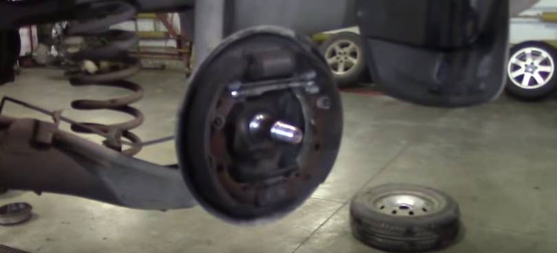 - Затем автомобиль устанавливается на домкрат, чтобы была возможность окрутить задние колеса и провести демонтаж тормозных барабанов.