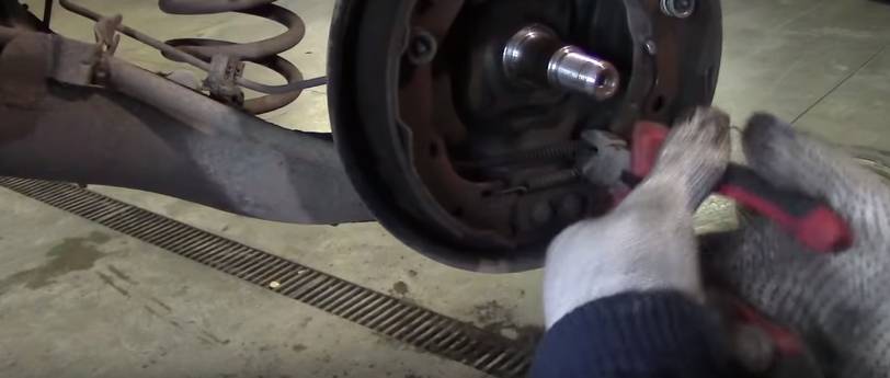 - Теперь на обоих колёсах демонтируйте заднюю тормозную колодку, сняв с неё специальные стяжные пружины.