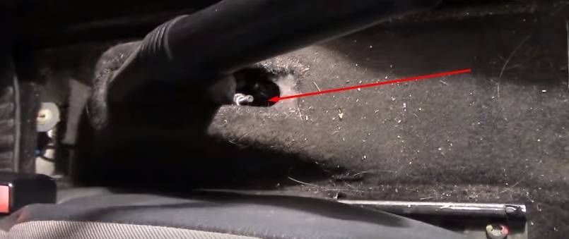 Ножом аккуратно разрезаем ковровое покрытие пола за рычагом стояночного тормоза. Приподняв рычаг стояночного тормоза, отсоединяем колодку проводов от выключателя сигнализатора стояночного тормоза.