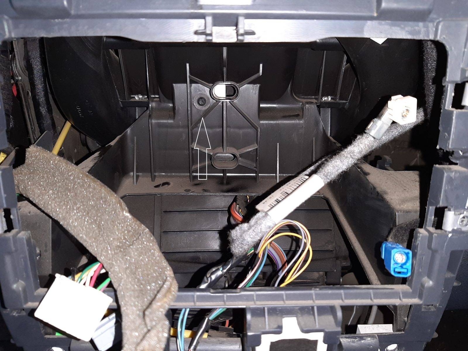 - Снимаем блок, который крепится на полозьях в нижней части бардачка, не отключая клеммной колодки.