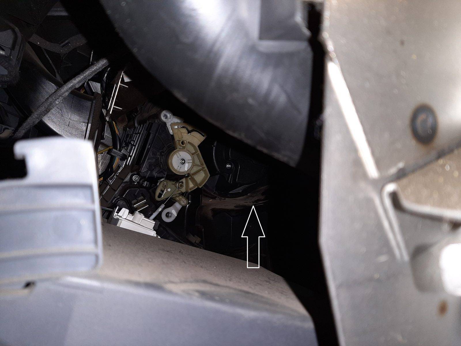 - Вентилятор в сборе с двигателем можно пытаться достать из-под панели, но он не пройдет сквозь щель между днищем и бардачком.