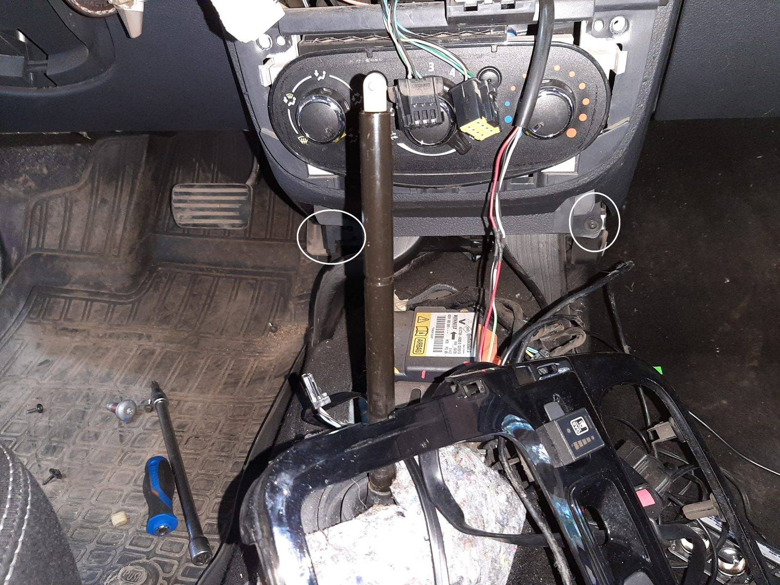 Далее снимаем декоративную накладку с центральной панели, она крепится на защелках. Дольше откручиваем все видимые саморезы и одну гайку и демонтируем центральную консоль.