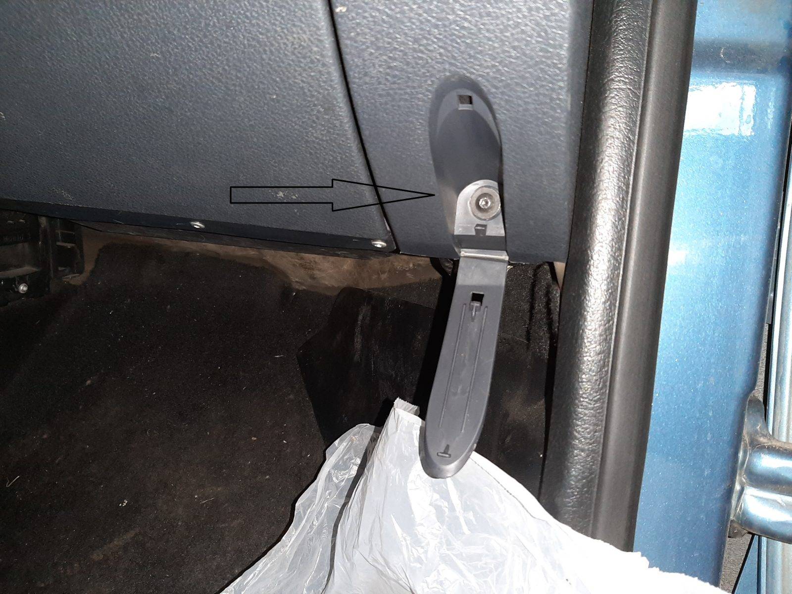 Затем аккуратно с помощью плоской отвёртки отсоединив заглушку в правом нижнем углу панели у бардачка, откручиваем второй винт.