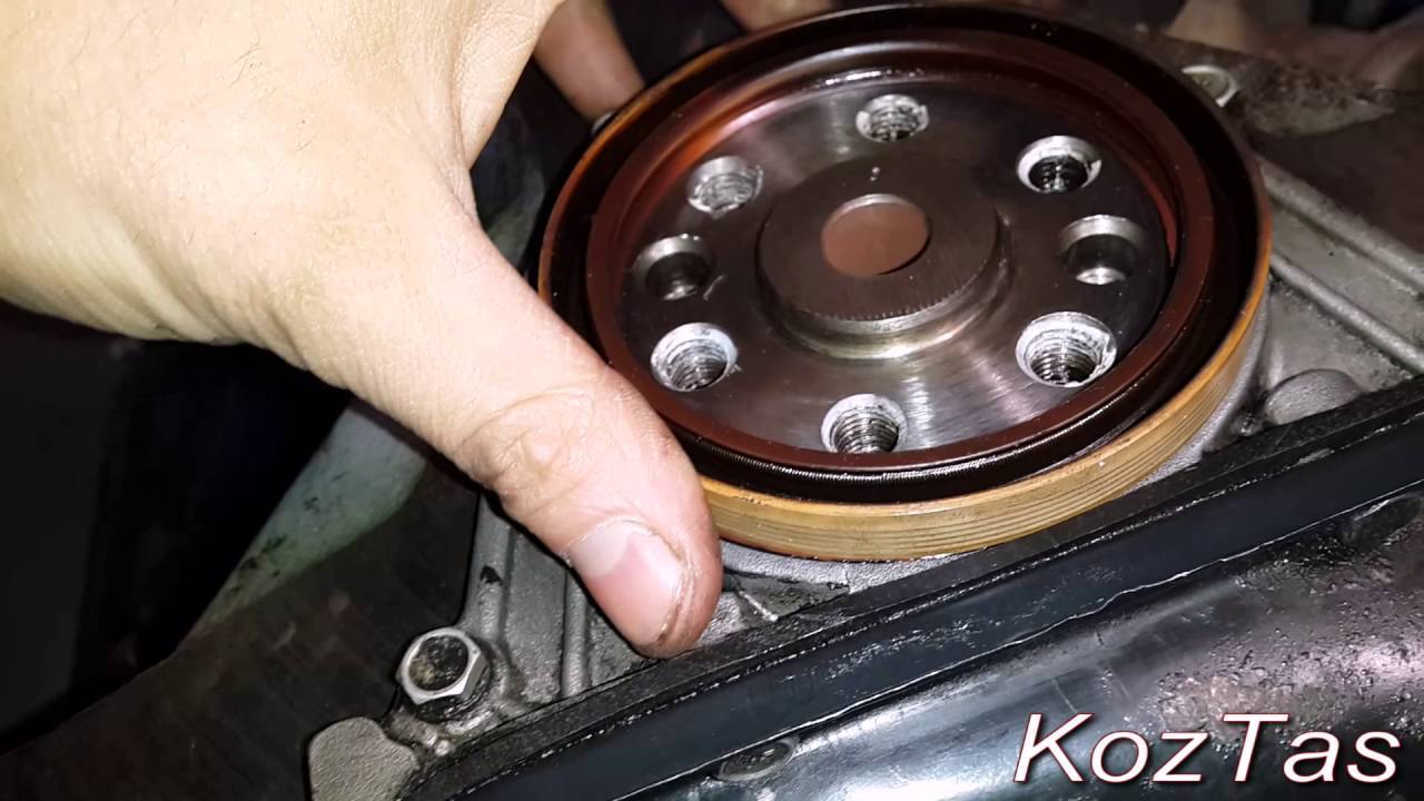 Он снимется вместе с сальником коленвала. Вытащить уплотнитель получится легко, если использовать что-нибудь острое. Чтобы новый сальник легче вошел, смажьте его маслом. Запрессовать уплотнитель можно, используя оправку либо старый сальник.