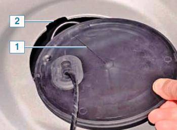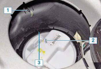 При установке ориентируем топливный модуль так, чтобы стрелка 2 на его крышке располагалась напротив стрелки 1 на баке. Надавив сверху вниз на крышку модуля, наворачиваем прижимное кольцо на горловину бака до тех пор, пока крышка модуля не будет плотно прижата к горловине. Затем доворачиваем прижимное кольцо до положения, при котором стрелка 3 на кольце расположится напротив стрелок 1 и 2. Наконечник топливной трубки надеваем на штуцер крышки модуля до щелчка пружинных фиксаторов наконечника. После установки модуля включаем зажигание и проверяем герметичность соединений. При установке крышки лючка топливного бака ориентируем ее так…