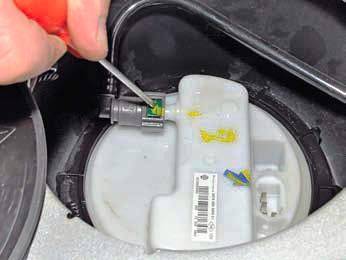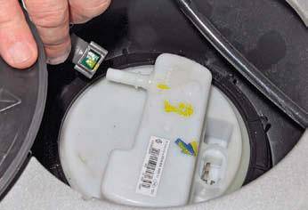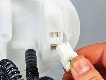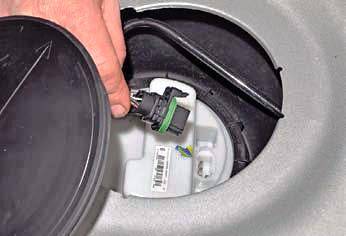 Отсоединяем колодку проводов датчика указателя уровня топлива от разъема на внутренней стороне крышки топливного модуля.