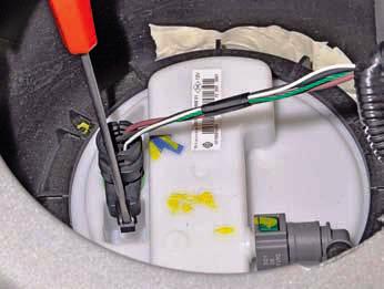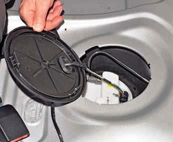 …и отсоединяем колодку от разъема крышки топливного модуля. Для сброса давления топлива в системе питания пускаем двигатель и даем ему поработать на холостом ходу до остановки из-за выработки топлива. Затем включаем стартер на 2–3 с. После этого давление топлива в топливной системе будет сброшено. Отсоединяем клемму провода от «минусового» вывода аккумуляторной батареи.