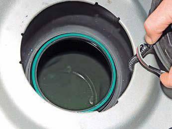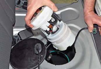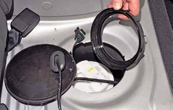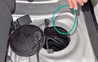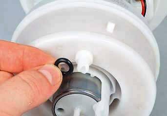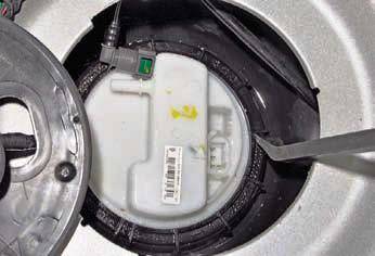 Вынимаем уплотнительное резиновое кольцо топливного модуля. Сливаем остатки топлива из топливного модуля в заранее подготовленную емкость. Закрываем отверстие в топливном баке плотной бумагой или полиэтиленом. Дальнейшая разборка топливного модуля не предусмотрена. Разработчиками автомобиля предполагается замена всего модуля при выходе из строя любой из его составных частей. Однако, в чрезвычайных обстоятельствах можно очистить сетчатый фильтр на входе в топливный насос, заменить датчик указателя уровня топлива или топливный насос.