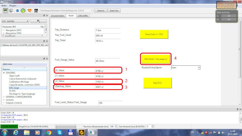 Как я выяснил на нём в окошке 1 отображался реальный уровень в баке — 5000 cl или сантилитров. 1 литр = 100 сантилитрам, т.е. делим эту цифру на 100 и получаем 50 литров — полный бак.Далее в окошке 2 было около 2800 сантилитров, т.е. около 28 литров. Как я понял — это отображаемый уровень — те самые 4-е квадратика.И в окошке 3 отображался запомненный уровень — тоже около 2800 сл.Рядом кнопка «RAZ ADAC + Recalage L2» (№4 на скриншоте 1). Переведя с французского «Recalage» я получил «пересчет» и нажав на эту кнопку произвел пересчет отображаемого уровня (L2). При этом стрелки приборки сначала судорожно подергались — не пугайтесь, так и должно быть. И на приборке загорелись 8 квадратиков уровня топлива.Казалось-бы — вот оно счастье. Но я решил разобраться почему при постановке машины на уклон меняется уровень и как этого избежать.Но сначала я открыл экран с настройками отображаемого уровня, т.е. какому объему соответствует каждый квадратик: